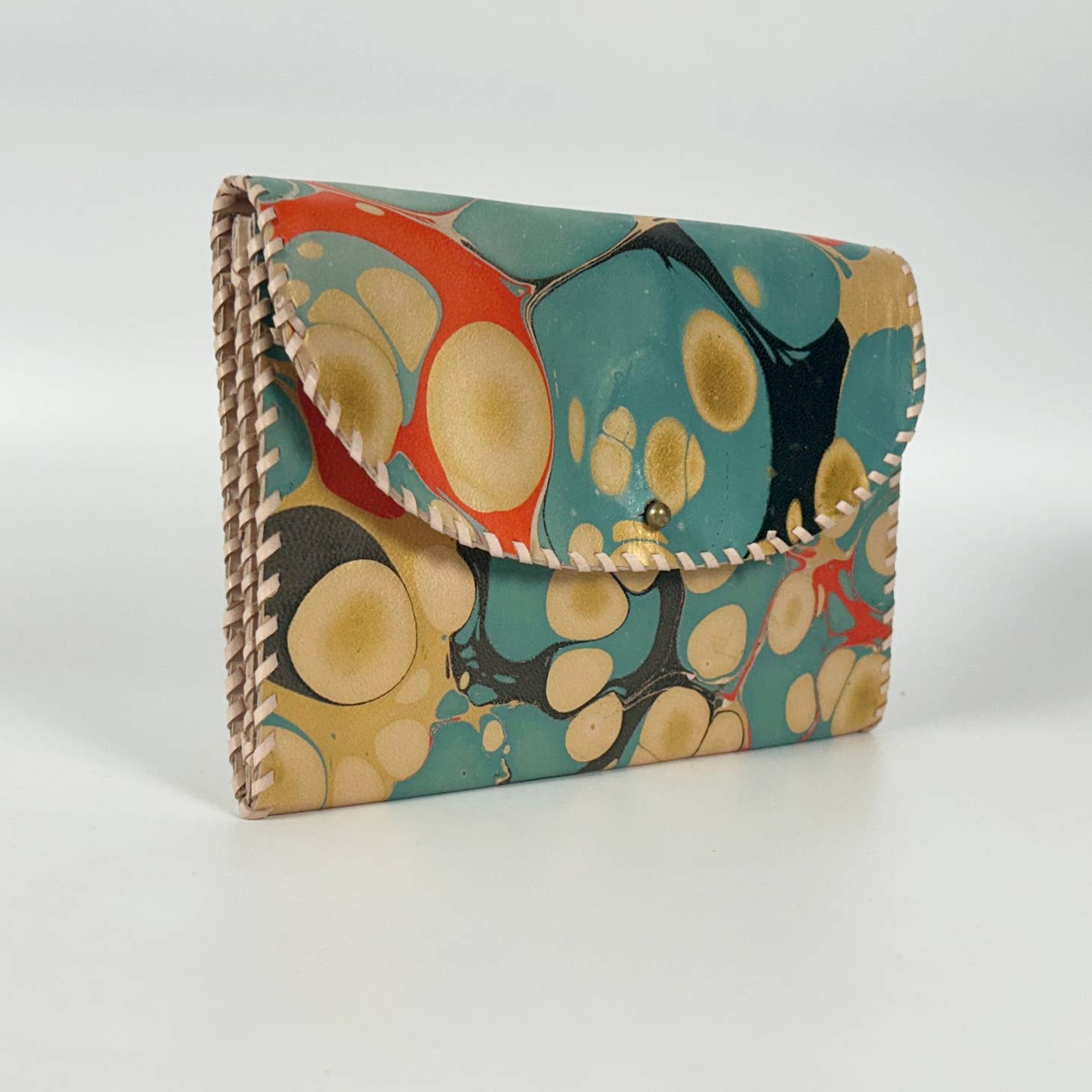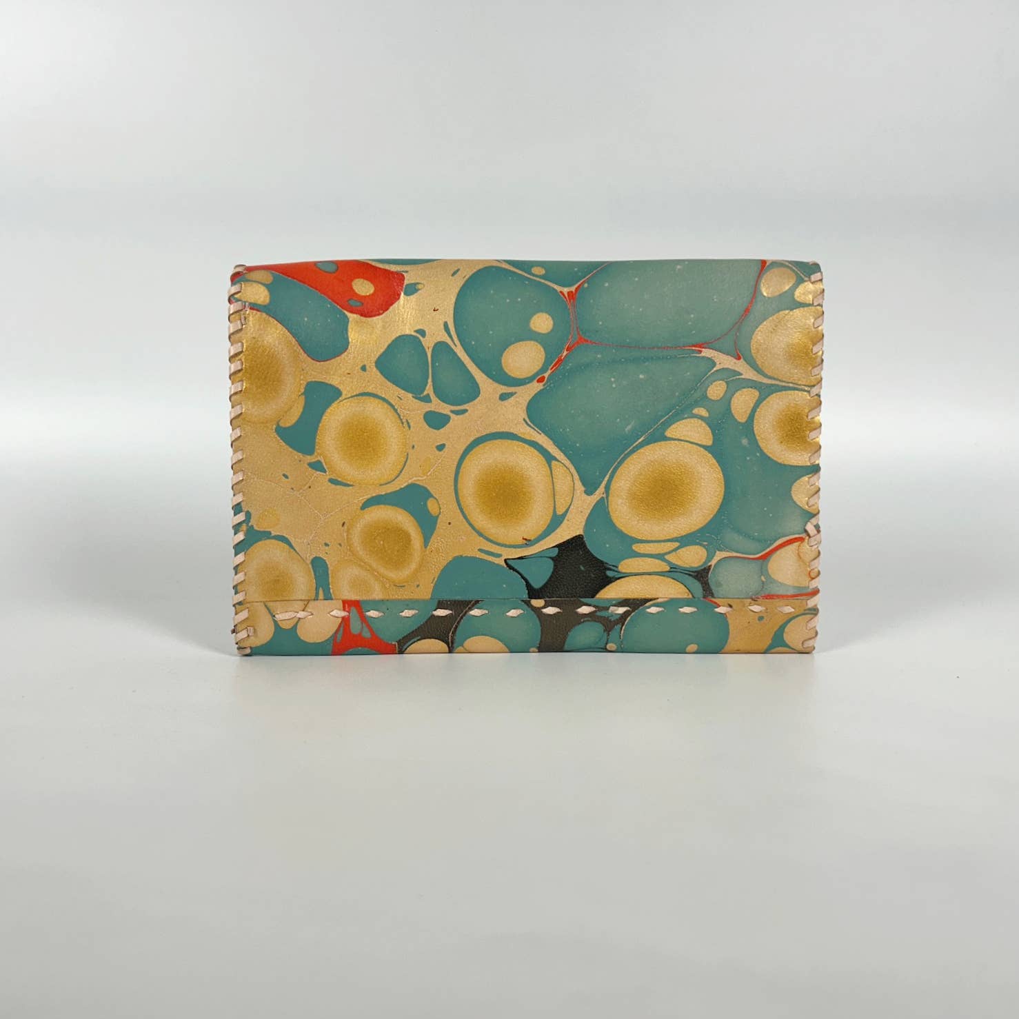 Artisan Handmade clutch with cotton lining. Made with handpainted marbled leather. Handstitched using leather strips creating beautiful whipstitch detailing. Button closure , 2 compartments,1 zipper pocket Size: 8"x 5.5". Can be customised by adding wristlet/crossbody belt