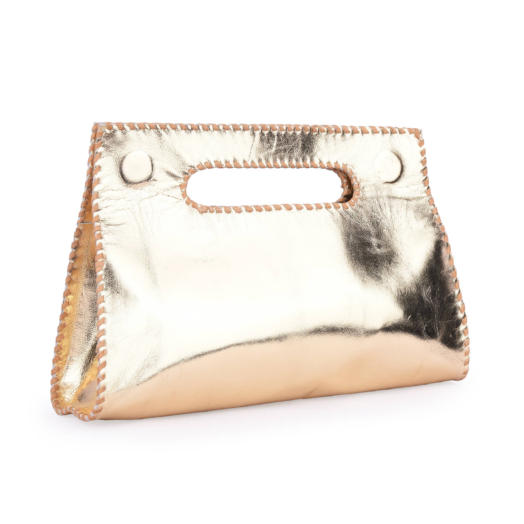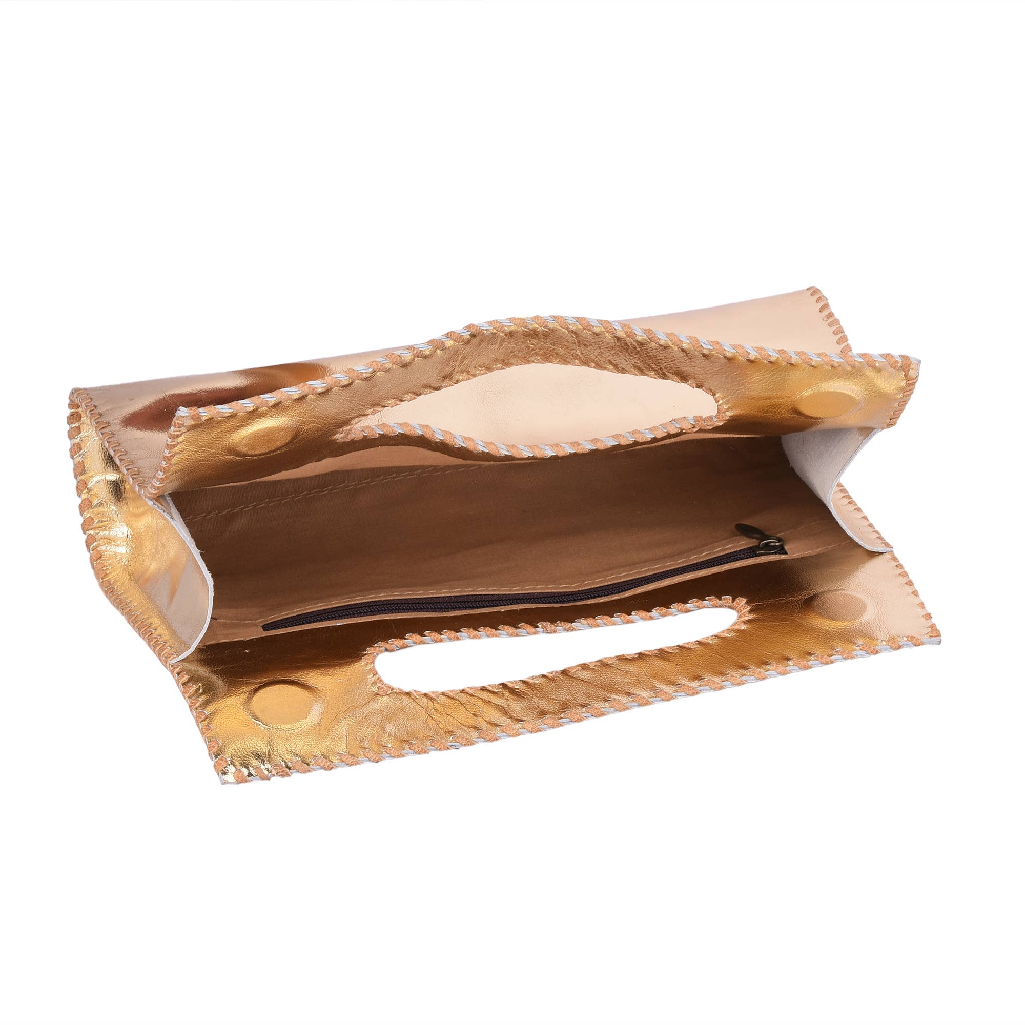 Artisan Handmade clutch . Made with premium metallic leather , cotton lined. Handstiched using leather strips creating beautiful whipstitch detailing.Magnetic Closure Inside Zip pocket 7"x11"x3"